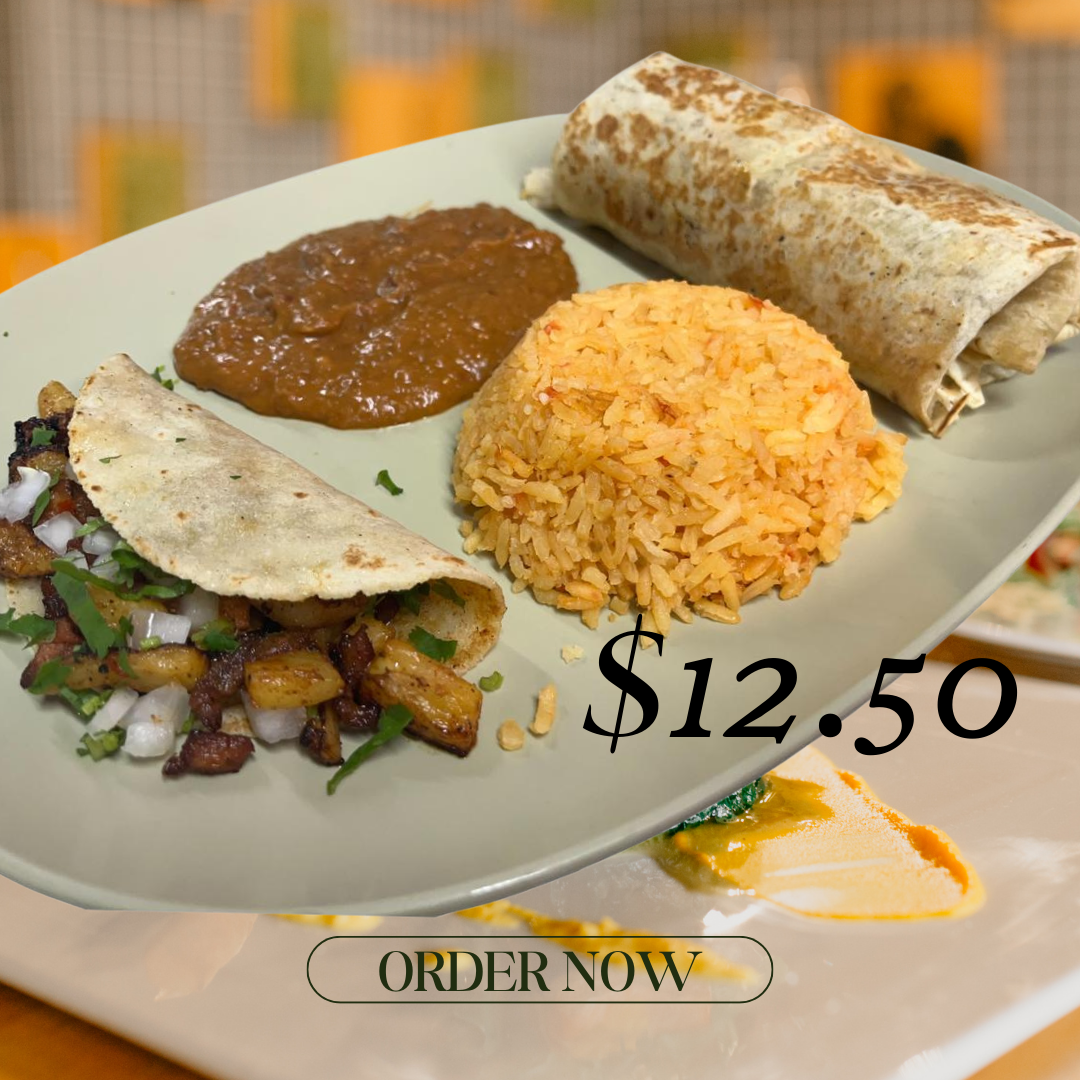 3 Tacos (choice of meats, no shrimp or fish) – $14.50, Burrito – $12.50, Burrito & Taco – $12.50, Enchilada & Taco – $12.50